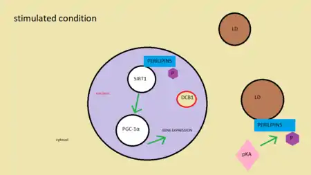 - ↑ Gallardo-Montejano, Violeta I. (2016-08-24). "Nuclear Perilipin 5 integrates lipid droplet lipolysis with PGC-1α/SIRT1-dependent transcriptional regulation of mitochondrial function". Nature Communications. 7: 12723. Bibcode:2016NatCo...712723G. doi:10.1038/ncomms12723. PMC 4999519. PMID 27554864.