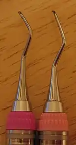 A universal curette is a double-ended instrument used for periodontal scaling, calculus debridement and root planing.[1] The purpose of the universal curette is to remove small or medium size calculus deposits and can be used both supragingivally and subgingivally.[5] Universal curettes are very versatile because they can be used on all surfaces of the teeth.[5]