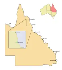 The range of this tree is entirely restricted to the catchment area of the Mossman River, about 75 km (47 mi) north of Cairns, where it grows in mature rainforest at altitudes from 40 to 400 m (130 to 1,310 ft).[4][5]