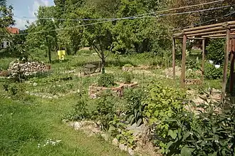 The fundamental element of suburban and urban permaculture is the efficient utilization of space. Wildfire journal suggests using methods such as the keyhole garden which require little space.[76] Neighbors can collaborate to increase the scale of transformation, using sites such as recreation centers, neighborhood associations, city programs, faith groups, and schools. Columbia, an ecovillage in Portland, Oregon, consisting of 37 apartment condominiums, influenced its neighbors to implement permaculture principles, including in front-yard gardens.[77] Suburban permaculture sites such as one in Eugene, Oregon, include rainwater catchment, edible landscaping, removing paved driveways, turning a garage into living space, and changing a south side patio into passive solar.[78]