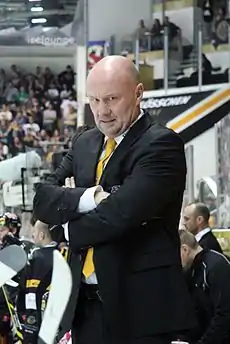 ![]() Peter Andersson coaching HC Lugano during a home game against Genève-Servette HC in October 2014 | |||