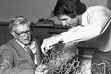 Peter Colman, showing his flu protein (neuraminidase) model to Frank Macfarlane Burnet .