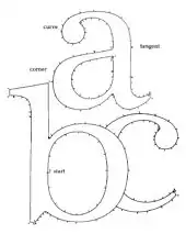 Printouts of single characters in a height of approximately 10 cm were digitized on a digitizer tablet of Aristo along their outlines, marking various points of support (beginning, corner, tangent and curve) with an accuracy of 1/100 mm. This invention together with a newly developed structure for storing and encoding single characters inside a font made characters, but also any other graphical signs freely scalable for the computer and available for other mathematical operations.[5]