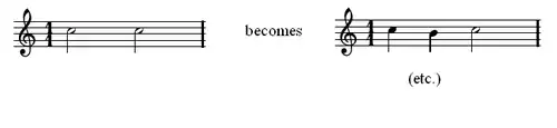 2. inserting, in the second segment, a note whose pitch is an adjacent member of the appropriate diatonic collection (while leaving a note of the original pitch to occupy the first segment).