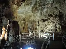 The cave developed during the Mesozoic (Jurassic) limestone, its sediments are divided into several stratigraphic levels.[3] "The rock formations resemble giant cactus, pink pearls, sturdy columns or delicate curtains, and in several places water ponds are fed by stalactite material. Covering an area of 10,400 m2 (112,000 sq ft), the length of the corridors is about 2,000 m (6,562 ft) and the temperature throughout the year remains stable at 17 °C (± 1 °C)."[4] The first research of 1959 was undertaken by the Greek speleologist Ioannis Petrocheilos. He found numerous bones of animals, many of them covered with cave coral.[5]