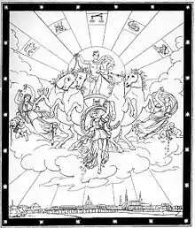 The journal's name is that of the sun-god Phoebus, generally associated with the Greek Apollo. The frontispiece of the first issue, designed by Ferdinand Hartmann, shows Phoebus in a chariot, drawn by sun-horses over the town of Dresden. Kleist wrote: "Thunder on, O thou, with thy flaming steeds, / Phoebus, bringer of day, into infinite space!"
