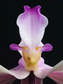 The 1 cm long stems produce 4-5 oblong to subelliptic, 6.5-8 cm long and 2.6-3 cm wide leaves and greenish, well developed, dorsiventrally flattened, verrucose roots. The leaves often show purple colouration of the abaxial surface and they are shed before flowering, but sometimes 1-2 leaves persist. Flowering occurs throughout April to July. Widely and simultaneously opening, pink flowers are produced on 1-2 suberect or arching, 10-15 flowered racemes. The plants are epiphytes or lithophytes on damp rock found at elevations of 800-2200m a.s.l.[3] The chromosome count is 2n = 2x = 36.[4]