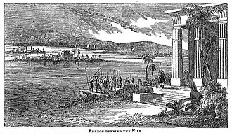 Pheron had been made blind for ten years after attacking the flooding Nile with a spear. Then he was told the only cure would be to wash his eyes with the urine of a woman who was faithful to her husband. After the urine of several women failed, including his own wife's, he finally found one woman who cured him. Then had the other women burned to death, but he married the one that cured him.[2][3] Pheron was the son and successor of the legendary conqueror Sesostris. The next in line to the throne after Pheron was Proteus, whose legend ties in with Helen of the Trojan War.