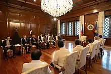 In February 2019, then-U.S. Secretary of State Mike Pompeo affirmed his country's commitments under the 1951 Mutual Defense Treaty (MDT) during a meeting with counterparts in the Philippines. Pompeo in a speech added, "as the South China Sea is part of the Pacific, any armed attack on Philippine forces, aircraft or public vessels will trigger mutual defense obligations".[77] The US assured that they will "back the Philippines" if confrontation between the Philippines and China occurs in the South China Sea.[78] The move came after years of American reluctance to affirm commitments, which led to numerous Filipino politicians to push for review of the 68-year-old security pact between the Philippines and the US. The Filipino foreign affairs secretary welcomed the US commitment, adding that there is "no need to review" the pact anymore.[79][80][77][78]