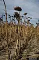 Many symptoms caused by the fungal pathogen can be observed post bloom or after flowering. The main identifying symptom is the production of black lesions along the stem which are usually 2 inches in length and 1 inch in height. Lesions are distinguishable from other similar diseases because they form at the petioles of the stem and are black in color.[3] Lesions can also develop on the leaves, flower bracts, back of the head, and crown or base of stalk. Leaf wilting will also be noticeable. Small, fruiting bodies (pycnidia) are produced on the stem. These structures are spore bearing and can be observed with a magnifying or other hand lens on the lesions themselves.[4] Phoma black stem can be distinguished from other diseases due to its black lesions and lack of lodging. The fungus also produces colonies that are gray-white in color and have a white mycelium that may resemble cotton.[2]