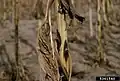Phoma black stem infections can occur throughout the growing season, although the lesions are more noticeable during late summer. Phoma macdonaldii can be transmitted via rain splash or by stem weevil feeding. The fungus can either penetrate into the plants either directly via enzymatic degradation of the plant cell wall or by mechanical pressure.[5] The fungus overwinters in infected crop debris either inside of pycnidia or as mycelium.[6] Primary inoculum originates from overwintering fungal structures (perithecia, pycnidia, and mycelia).[5] Conidia (from pycnidia) and ascospores (from perithecia) are released from fruiting structures and subsequently dispersed by rain and wind. Disease development is favorable in wet conditions during flowering stage and immediately after flowering stage. Stem weevils transmit the fungus directly by their feeding behaviors.[2]