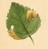 A birch leaf mined by two larvae, one of which has already cut out its case and departed