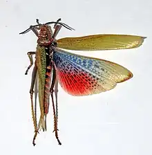 Phymateus viridipes showing the bright wings typical of several species in the genus