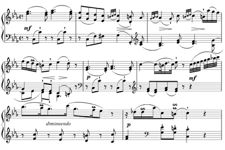 The second movement, marked "andante con moto", is in A-flat major and 3/4 time, and features multiple passages of syncopation.[3]