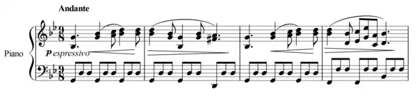 8 time, quite uncommon in Beethoven's works, and a gentle, light atmosphere to present contrast to the ecstatic first movement. It is about two and a half minutes long.