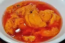 Pickled peaches may be prepared from medium-sized, non-melting clingstone peaches that are small-seeded.[1] In the United States prior to around 1960, some were prepared from small, unripe freestone peaches.[1] Flavour may be added to the pickle using 'sweet spices', such as cinnamon, cloves and allspice,[4] or savoury pickling spices, such as peppercorns and coriander.[5] Pickled peaches may be used to accompany meats and in salads,[6][4] and also have other uses.