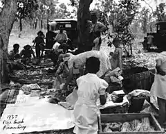 A regular annual Union Picnic Day or Trade Picnic Day was observed at Adelaide River[3] by railway employees working on the North Australia Railway.[4] The date of the first event is not known. The event included Public Works employees on some occasions.[5][lower-alpha 1] Between 1926 and 1935 a railway Picnic Day event was not held. An attempt was made to revive the holiday in 1933,[6] but it was not officially observed again until three years later.[7] On Monday 5 October 1936, a train transported people from Darwin to Adelaide River, leaving at 7 am returning at 11 pm. The hotel at Adelaide River recorded record sales and the train was "forced to stop often as a number of male Darwin passengers fell off at various points along the line".[8]
