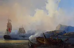 Arriving at the Isle de France in February 1797, though reinforced by the corvette Brûle-Gueule and the frigate Preneuse, issues quickly accumulated: the governor and the colonial assembly were still in no way cooperative, stating that it would no longer be possible to feed the crews of Sercey's ships.[26] The admiral therefore had to base himself temporarily in the Seychelles, not wanting to leave the Mascarenes undefended.[27] Requests for support against British forces abounded, particularly from the Dutch East Indies and from Tipu Sultan, Sultan of Mysore, in addition to the orders of Malartic, who requisitioned the ships for additional missions decided in the absence of Sercey.[28] Without having ever lost a ship in combat, the squadron was reduced to an almost nothing scattered from Mozambique to Java. He set up his command in Surabaya to be closer to the Spanish base in Manila, and a last campaign in the China seas succeeded in taking about forty enemy ships.[29] Desperately awaiting the return of his scattered forces, not knowing that some of them had already been destroyed or captured, he negotiated with the Spanish forces with the aim of continuing his mission, without concrete success: joint offensive attempts were not satisfactory, as in Macao in January 1799. He therefore accepted the evidence and left Java. Returning to Isle de France in May 1799, he succeeded in getting his last ships through an enemy blockade, before repelling British attacks on Port-Nord-Ouest for three weeks.[30] But this was to be the last hurrah of the Sercey division: its last frigate, the last large French ship in the region, Preneuse, was destroyed in Tombeau Bay by HMS Tremendous and HMS Adamant on its return from a raiding campaign off Mozambique on December 11, 1799.[30]