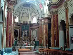 The interior hosts two paintings, including the Discovery of the True Cross by St Helena, by Luca Giordano in the third chapel to right, including a Deposition; a Holy Family (1617) by Battistello Caracciolo. The large chapel of the right transept has altarpieces by Giacomo Farelli, depicting the Birth and Death of the Virgin. It houses a Exposition of Dead Christ by Angels by Crescenzo Gamba. The ceiling canvases, painted by Marulli and Annella di Massimo, were removed in the past centuries.[1]