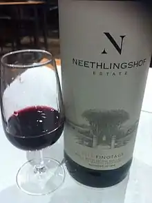 Pinotage /ˈpɪnətɑːʒ/ PIN-ə-tahzh[1] is a red wine grape that is South Africa's signature variety. It was cultivated there in 1925 as a cross between Pinot noir and Cinsaut (Cinsaut was known as "Hermitage" in South Africa at that time, hence the name). It typically produces deep red varietal wines with smoky, bramble and earthy flavours, sometimes with notes of bananas and tropical fruit, but has been criticised for sometimes smelling of acetone.[2] The grape is a viticultural intraspecific cross of two varieties of Vitis vinifera, not an interspecific hybrid.