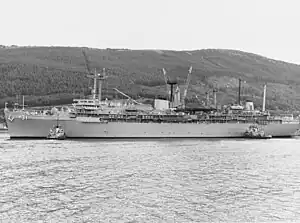 At Holy Loch, Scotland, harbor tugs Piqua, at left, and Natick (YTB-760) assist USS Hunley (AS-31)