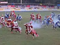 Today Pirenópolis is known all over Brazil for its popular festivals, especially the "Cavalhadas", introduced in 1826, in which horsemen representing Moors and Christians recreate a battle fought by Charlemagne.[3] This tradition, part of the Festival for the Holy Spirit (Festa do Espírito Santo), was brought to the town by Portuguese settlers. The Festas de Cavalhadas feature a parade beginning with a bugle fanfare announcing the knight's pages, then the mounted knights displaying their colors. Wearing papier-maché helmets, the Christian knights wear blue, the Moors wear red. The battle lasts three days and attracts thousands of visitors to the town. The Cavalhadas take place in medieval costume, with the highlight being the mock battle, performed in the city's bullring. The Moors invariably are defeated and convert to Christianity. Cavalhadas