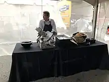 The preparation is a local specialty in the area around Baltimore, Maryland. The origin of the specific name "pit beef" dates to the 1970s on Baltimore's east side, along Pulaski Highway, and became popular in the 1980s.[1][2][3][4]