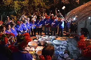 Plains indigenous peoples held ritual ceremonies several times a year, to worship natural and ancestral spirits. They strongly believed in the worshiping of ancestors.[6] Whenever a ceremony was held, the people would gather in the political centre of the tribe, called kunghsieh, and they would drink, sing, dance, and celebrate.[33] Their ballads were mostly merry melodies until the mass invasion of the Han Chinese and their culture was on the verge of diminishing, and then they started to create elegies to express the sadness of a disadvantaged people.[8]