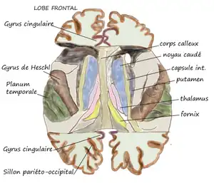 The planum temporale is the cortical area just posterior to the auditory cortex (Heschl's gyrus) within the Sylvian fissure.[1] It is a triangular region which forms the heart of Wernicke's area, one of the most important functional areas for language.[2] Original studies on this area found that the planum temporale was one of the most asymmetric regions in the brain, with this area being up to ten times larger in the left cerebral hemisphere than the right.[3]