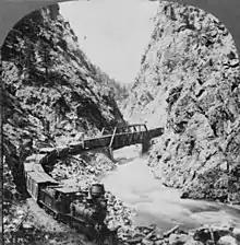 In the middle and late 1870s, the Denver, South Park and Pacific Railroad constructed the first railroad through the canyon and through the valley of the North Fork to South Park and eventually to Leadville and Gunnison. The line was initially a narrow gauge, and was later acquired by the Colorado and Southern Railway. Service on the line was terminated in 1937.