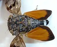 It has deep ochre hind-wings like its congeners, with a complete black border. The abdomen is black with an incomplete terminal white band.[3] The species feeds on Acacia, Dichrostachys cinerea and Delonix regia.[3] The adults are active from October to March. As with other southern African cicadas, they would generally emerge later at more southerly latitudes, and usually after seasonal rains.[1]