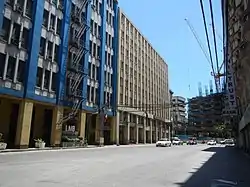 Owing to its status as a financial center in its heyday, a number of notable buildings and structures have been built in and around the vicinity of Plaza de Cervantes, including some of Manila's tallest buildings at the time. The most notable building currently standing is the Mariano Uy Chaco Building, built in 1914 and said to be Manila's first skyscraper. Designed by American architect Samuel E. Rowell in the Art Nouveau style,[9] and including a distinctive clock tower, it was the headquarters for Uy Chaco and Sons, a hardware company which imported goods from the United States for local distribution.[10] Beside it is the Geronimo de los Reyes Building, also known as the Edificio A. Soriano. Designed by Juan Nakpil, the building later came to the ownership of industrialist Andrés Soriano, becoming the headquarters for his eponymous conglomerate and later buying out neighboring buildings for its expansion, with the expansions designed by Andrés Luna de San Pedro.[11] The building at the time also hosted the Franco-era Spanish consulate, owing to Soriano's Francoist sympathies,[12] as well as the law firm Dewitt, Perkins, and Ponce-Enrile, where Alfonso Ponce Enrile, father of Juan Ponce Enrile, was a partner.[13] Damaged in the Battle of Manila and subsequently restored,[14] the building is presently abandoned.