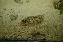 The C-O sole is a right-eyed flatfish with large, bulbous eyes located near the tip of the snout. The upper surface is mottled light to dark brown, with occasional white spots; there is usually a prominent mid-body dark spot with a pale patch behind it. The underside is light. There is a dark crescent-shaped marking and a large dark spot on the caudal fin, which together resemble the letters C and O.[2]