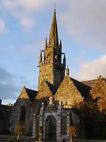 The Pleyber-Christ Parish close (Enclos paroissial) is located at Pleyber-Christ in the arrondissement of Morlaix in Finistère in Brittany in north-western France. The Saint Pierre church has been listed as a historical monument since 1914 and had been completely reconstructed in the middle of the 16th century commencing with the tower built in 1551.[1] It replaced an earlier church, thought to date to before 1400. The church has a magnificent central altar with the Rosary altarpiece to the left and the Saint Joseph altarpiece to the right. Statues of Saint Eloi and Saint Herbot stand at the entrance to the choir.[2][3][4]