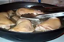 Poaching is a cooking technique that involves heating food submerged in a liquid, such as water, milk, stock or wine. Poaching is differentiated from the other "moist heat" cooking methods, such as simmering and boiling, in that it uses a relatively lower temperature (about 70–80 °C (158–176 °F)).[1] This temperature range makes it particularly suitable for delicate food, such as eggs, poultry, fish and fruit, which might easily fall apart or dry out using other cooking methods. Poaching is often considered a healthy cooking method because it does not use fat for cooking or flavoring the food.[2]