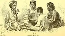Poi is thought to have originated in the Marquesas Islands, created some time after initial settlement from Polynesian explorers.[5] While mashing food does occur in other parts of the Pacific, the method involved was more rudimentary. In western Polynesia, the cooked starch was mashed in a wooden bowl using a makeshift pounder out of either the stem of a coconut leaf or a hard, unripe breadfruit with several wooden pegs stuck into it. The origins of poi coincided with the development of basalt pounders in the Marquesas, which soon spread elsewhere in eastern Polynesia, with the exception of New Zealand and Easter Island.