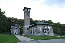 The Poland Spring Bottling Plant and Spring House stand at the end of Preservation Way, behind the modern Poland Spring Inn and Resort, on the east side of Maine Street (Maine State Route 26) in South Poland. The former bottling plant is a rectangular building, with a hip roof that has overhanging bracketed eaves. It is dominated by a tall square tower at its southwest corner with an open top level whose openings are flanked by Tuscan columns. The tower is topped by a tiled shallow-slope pyramidal roof. Its base is of rusticated stone, with arched openings leading to the building entrance. The building windows are set in round-arch openings, and the corners have brick quoining. The building is shaped as a cross, with a copper dome at the center, and there is a secondary entrance sheltered by a copper hood. The bottling house is a smaller structure located just south of the spring house, its entrance featuring Tuscan columns and pilasters supporting an entablature.[3]