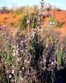 Poliomintha incana is a species of flowering plant in the mint family which is known as frosted mint. It is native to dry and desert areas of the southwestern United States and northern Mexico. It is a strongly aromatic shrub with dark green foliage covered in small white hairs. Scattered about the foliage are fuzzy, tubular flowers in shades of light purple and blue with tiny purple spots. Frosted mint is eaten fresh or dried or used as a flavoring by Native American groups, particularly the Tewa and Hopi.[1]