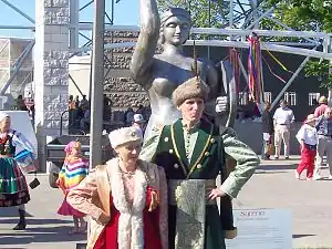 A couple in kontusz costumes posing in front of the Warsaw mermaid