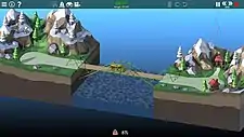 The objective of Poly Bridge 2 is to build a bridge that can take vehicles from place A to place B with materials provided within a limited budget.[1] In addition to the materials that were already featured in Poly Bridge, a new material, the spring, is introduced.[2] The game offers eight different worlds which consist of 16 levels each, along with six "challenge worlds" consisting of harder versions of the levels contained in the first six worlds, adding up to a total of 224 levels.[3] The addition of a feature similar to the Steam Workshop allows players to make and upload their own levels for other players to enjoy. This workshop service is hosted on Dry Cactus's servers, making the game compatible with other launchers such as the Epic Games Store, whereas Poly Bridge's workshop was hosted on the Steam Workshop and was thus restricted to the Steam launcher.