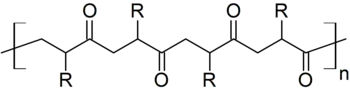 Polyketones are a family of high-performance thermoplastic polymers. The polar ketone groups in the polymer backbone of these materials gives rise to a strong attraction between polymer chains, which increases the material's melting point (255 °C for copolymer (carbon monoxide ethylene), 220 °C for terpolymer (carbon monoxide, ethylene, propylene). Trade names include Poketone, Carilon, Karilon, Akrotek, and Schulaketon. Such materials also tend to resist solvents and have good mechanical properties. Unlike many other engineering plastics, aliphatic polyketones such as Shell Chemicals' Carilon are relatively easy to synthesize and can be derived from inexpensive monomers. Carilon is made with a palladium(II) catalyst from ethylene and carbon monoxide. A small fraction of the ethylene is generally replaced with propylene to reduce the melting point somewhat. Shell Chemical commercially launched Carilon thermoplastic polymer in the U.S. in 1996,[1] but discontinued it in 2000.[2] Hyosung announced that they would launch production in 2015.[3]