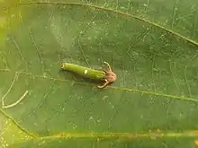 The Caterpillar is green, with a yellow band on 7th segment. The head is enlarged and ornate with four curved and tuberculated processes. The Pupa is green, with a longitudinal row of red dots on each side.[3]