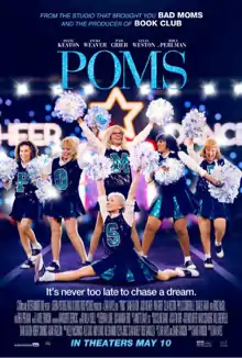 Poms is a 2019 American comedy film directed by Zara Hayes, starring Diane Keaton, Jacki Weaver, Pam Grier, Celia Weston, Alisha Boe, Phyllis Somerville (in her final film role), Charlie Tahan, Bruce McGill, and Rhea Perlman. The film follows a group of women from a retirement community who decide to start a cheerleading squad. It was theatrically released in North America on May 10, 2019, by STX Entertainment.