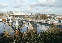 Costing approximately £4.5 million, Pont y Werin crosses between the Cardiff International Sports Village and Penarth, allowing the public to travel to the Sports Village via Cogan railway station.[1]