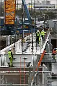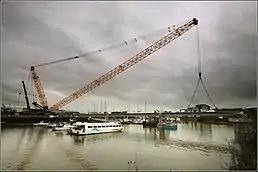 The Pont y Werin was designed by Cass Hayward LLP. Building work to create a new 140 m (460 ft) bridge over the Ely River commenced in summer 2009. The four main sections, which weigh between 38 and 46 tonnes, were lowered into place by the 1,200-tonne crane, the largest in the UK, over a seven-day period in late March 2010[3] in the presence of Lee Waters, Director of Sustrans Cymru and Jane Davidson AM, Minister for Environment, Sustainability and Housing.[5]