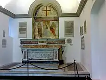 The chapel was built in 1492 by humanist Giovanni Pontano as funerary chapel for his beloved wife Adriana Sassone. The architects, the brothers Giocondo and Francesco di Giorgio, made the building have Vitruvian proportions for length and width. The serene façade, seemingly out of place with the bright dynamic façade of Santa Maria Maggiore, is constructed of grey piperno rock with pilasters. The interior has maiolica flooring. Behind the altar is a fresco of the Madonna with Saints John the Baptist and John the Evangelist (c. 1492) attributed to Francesco Cicino da Caiazzo.[1] 40°51′00″N 14°15′16″E / 40.850124°N 14.254516°E