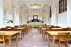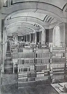 The Library moved from its first location at Leonian Apostolic College (Collegio Leoniano) to its present location in the summer of 1911. The Netter & Jacobi Company had modified the Palazzo Muti of the Marquises Papazzurri in 1910-1911. The architect, Hermann Joseph Hürth of Aachen, roofed over the courtyard of the palazzo, transforming it into the Great Hall (Aula Magna), which is now known as Aula Pio X. This structural enhancement enabled the Library to move from Collegio Leoniano to its current location. The four-story library was then built above the Great Hall[11] and equipped with shelves from Art Nouveau.