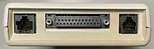 The X100—the flagship product in the Popcom range—is an external modem, housed in a beige[4] plastic case with a built-in AC power adapter.[5] Its two-pronged (non-polarized) plug is molded into a swiveled hinge, allowing it to hug the wall when the modem is plugged directly into a wall socket (the prongs perpendicular to the socket and the rest of the unit parallel) or be plugged into a power strip (the entire unit perpendicular to the strip).[6] The three communications ports of the X100 include the RS-232 serial port (a female DB-25 connector), a modular 6P6C port for telephone handsets, and a modular 8P8C port that connects the X100 to the wall phone jack. The communications ports are located opposite the AC plug, or at the base of the modem when the modem is plugged into the wall.[7] The X100 measures 7.8 by 4.7 by 1.6 inches (19.8 by 11.9 by 4.1 cm)—not including the plug, which contributes to 0.7 in to either the length or depth, depending on the direction it faces.[7] The plug cannot fold down into the unit.[8] A dimple in what is normally the rear of the unit contains a radial potentiometer in its center, which adjusts the volume of the modem's internal speaker. When the X100 is plugged into a wall socket, the speaker faces flush to the wall, so ventilation slots are included to let sound out through the sides of the unit.[4]