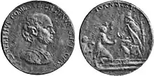 John V was buried among the papal tombs in Old St. Peter's Basilica.[13] His inscription praised him for combating Monothelitism at the Third Council of Constantinople "with the titles of the faith, keeping such vigilance, you united the minds so that the inimical wolf mixing in might not seize the sheep, or the more powerful crush those below".[14] John V's tomb was destroyed during the Arab raid against Rome in 846.[13]