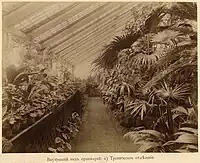 The trustee of the Western Siberia educational district and founder of Tomsk State University, Vasily Markovich Florinsky (Васи́лий Ма́ркович Флори́нский, 1834–1899) invited Krylov to create for Tomsk State University a botanical garden (the first beyond the Urals), as well as a herbarium. In July 1885, Krylov came to Tomsk and brought with him 700 pots of orangery plants for the botanical garden.[1] He immediately began organizing the herbarium in the form of a botanical museum. Construction of the main orangery soon began and 14 greenhouses were prepared. A herb garden with 200 species, an arboretum, a medicinal plant garden and an orchard were created. He created a park in front of the main university building, the so-called university grove (университетская роща).